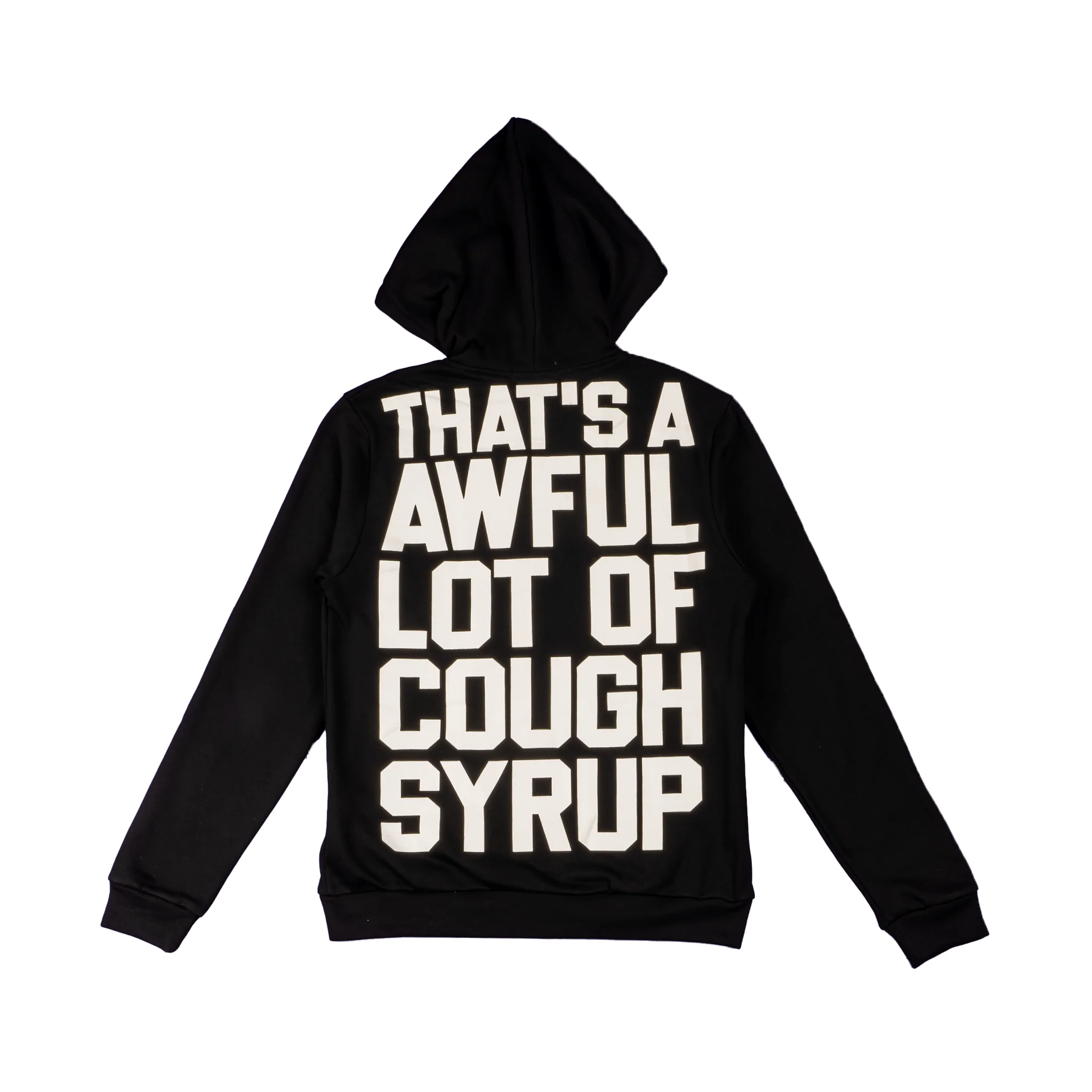 100% cotton relaxed fit hoodie with two front welt pockets, plastic zip, and classic Cough Syrup logo embroidered on front and screen printed across back.